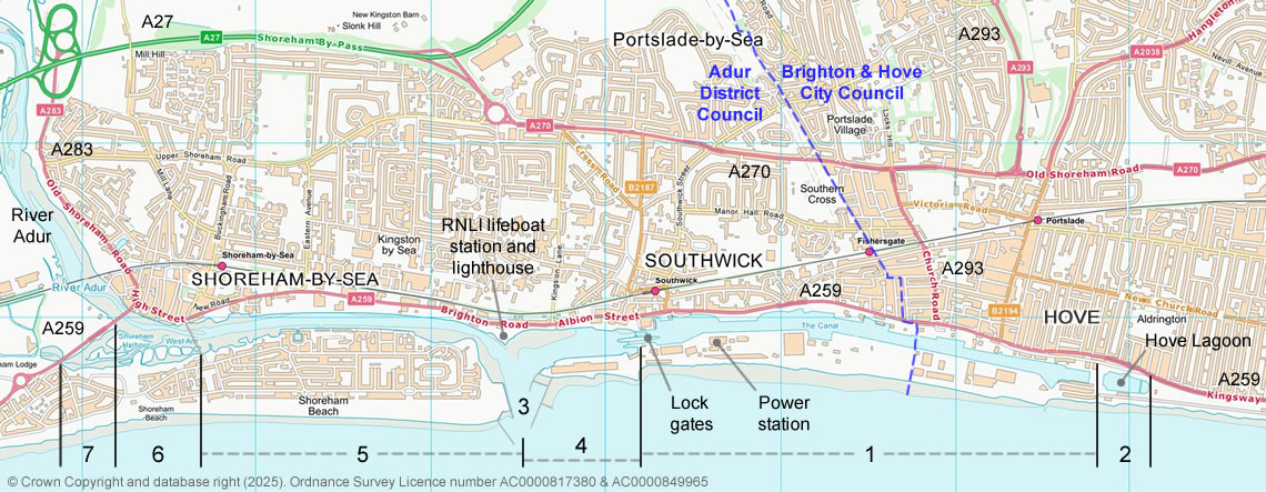 The blue dashed line shows the border between Adur District Council and Brighton & Hove City Council.